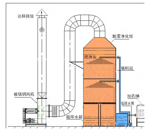 一个喷雾塔包括一个空塔和一套喷淋液体的喷嘴。一般情况下,气体由塔底进入,经气体分布系统均匀分布后向上穿过整个设备。而同时由或多级喷嘴喷淋液体,气体与液滴逆流接触,净化后气体除雾后从塔顶排出。